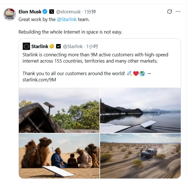 马斯克宣布星链活跃用户突破900万 47天新增100万用户