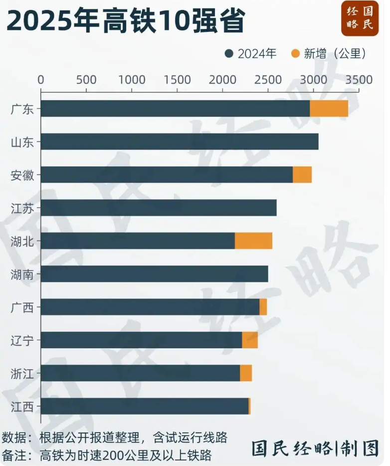 目前,全国只有广东、山东两省高铁运营里程超过3000公里,而超过2000公里的省份则有10多个。