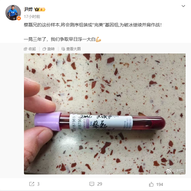 昨晚,华大集团CEO尹烨在微博晒出蔡磊的血液样本。他表示:“蔡磊兄的这份样本,将会测序组装成‘完美’基因组,为破冰继续并肩作战。一晃三年了,我们争取早日浮一大白。”
