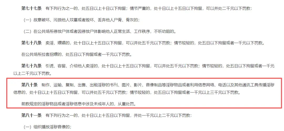 新修订的第八十条,明确写入“利用信息网络、电话以及其他通讯工具传播淫秽信息的”,不再区分传播场景的公开或私密、不再区分对象是一人还是多人,实质上是在行政法层面,为刑法尚未触及但确有社会危害性的行为提供兜底规制。