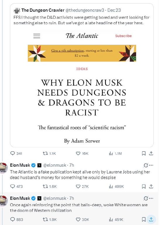 一位X用户分享了《大西洋月刊》11月份的文章《为什么埃隆·马斯克需要龙与地下城来成为种族主义者——“科学种族主义”的虚幻根源》。