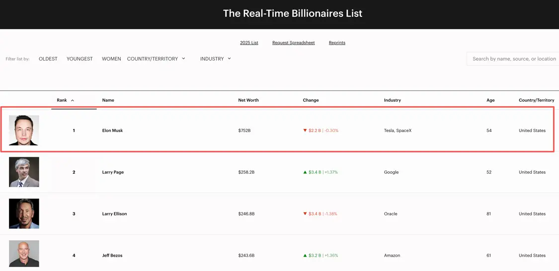 彭博亿万富翁指数显示,马斯克现在的净资产高达6470亿美元,今年以来已经增加了2150亿美元,遥遥领先于第二名的拉里·佩奇(Larry Page)。《福布斯》富豪榜则显示,马斯克的财富已经达到7521亿美元。