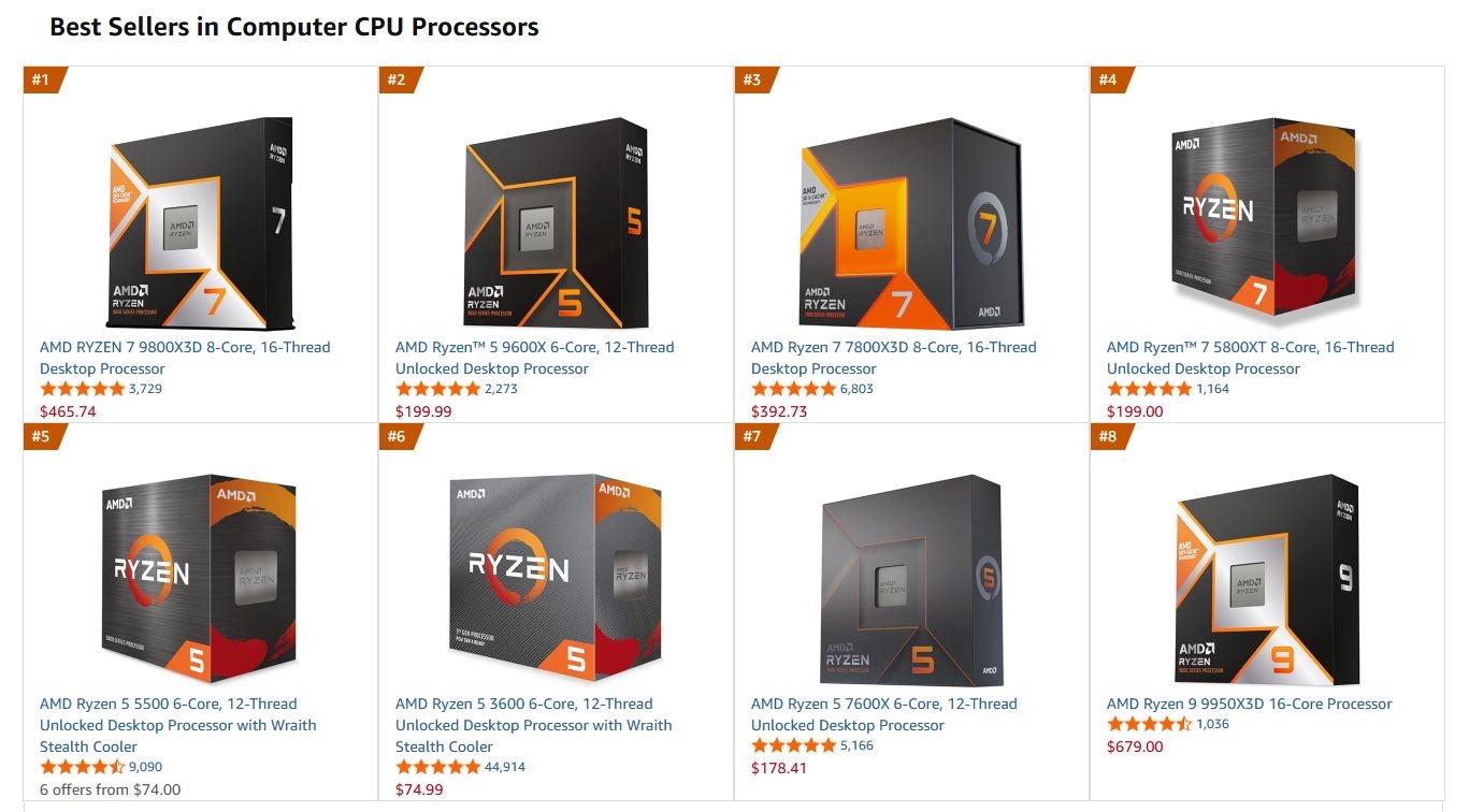 最令人意外的是,发布已久的锐龙5 3600竟然冲到了亚马逊CPU畅销榜的第6位。