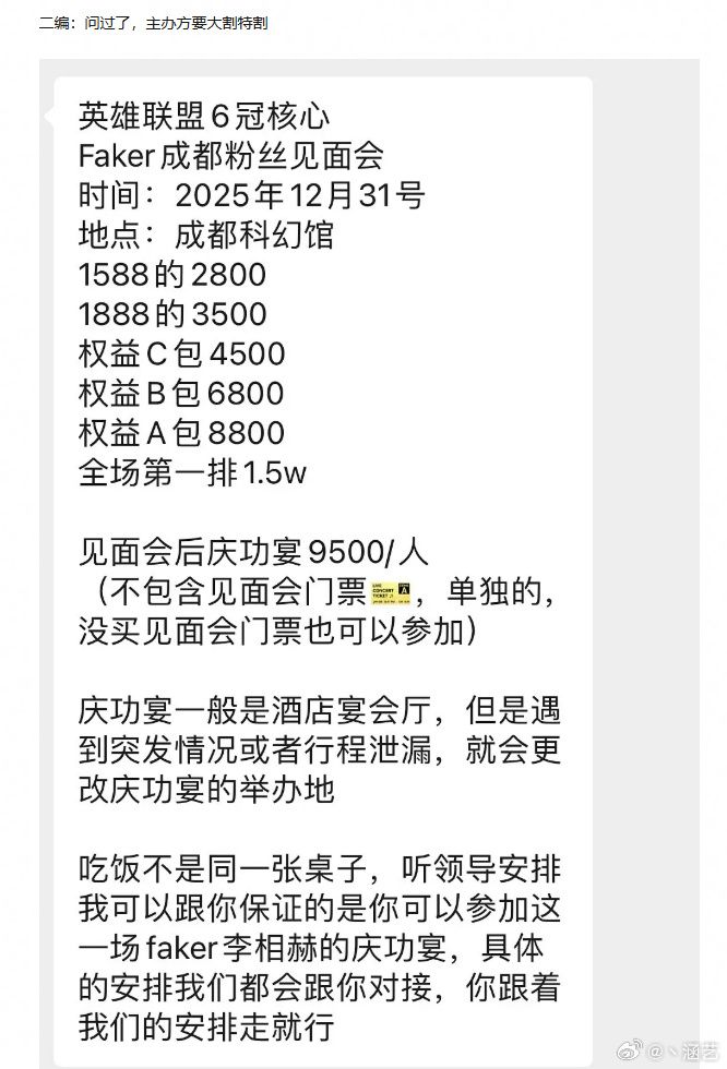 随着英雄联盟传奇选手 Faker(李相赫)成都见面会定档 2025 年 12 月 31 日,这场本该是岁末狂欢的活动却因“天价黄牛票”陷入舆论漩涡。然而,令人没想到的是,网络上今日流传一张截图显示,原本官方定价最高的 6988 元的门票,在黄牛手中第一排座位已被炒至15000元。而更离谱的是所谓的“晚餐资格”: