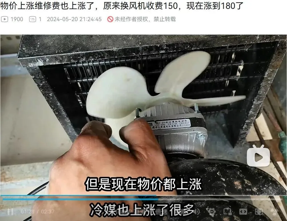另一方面,空调售后人工和零件成本,也确实变贵了。在B站平台上,有空调装修师傅表示,近年空调制冷剂价格涨了不少,物价也上涨了,自己的收费价格也提高了。