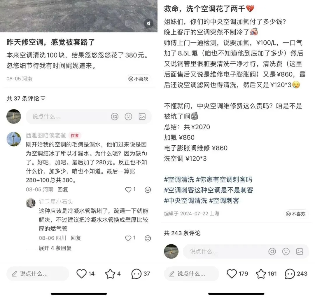 在社交平台上,有消费者表示,自己下单了百元左右的空调清洗服务,但师傅却在清洗过程中告知空调零件出现问题,要额外支付好几百的维修费用;还有师傅会在洗空调的时候建议更深度的清洁,结果清洗费用就翻了几倍。