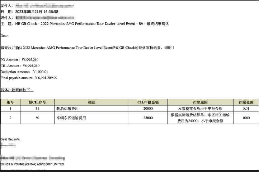 剩余尾款的终审工作由梅赛德斯-奔驰(中国)委托的安永(中国)企业咨询有限公司于2023年8月21日完成审计,报告明确审定应付金额为699.4万余元,剩余尾款可进入开票支付流程。