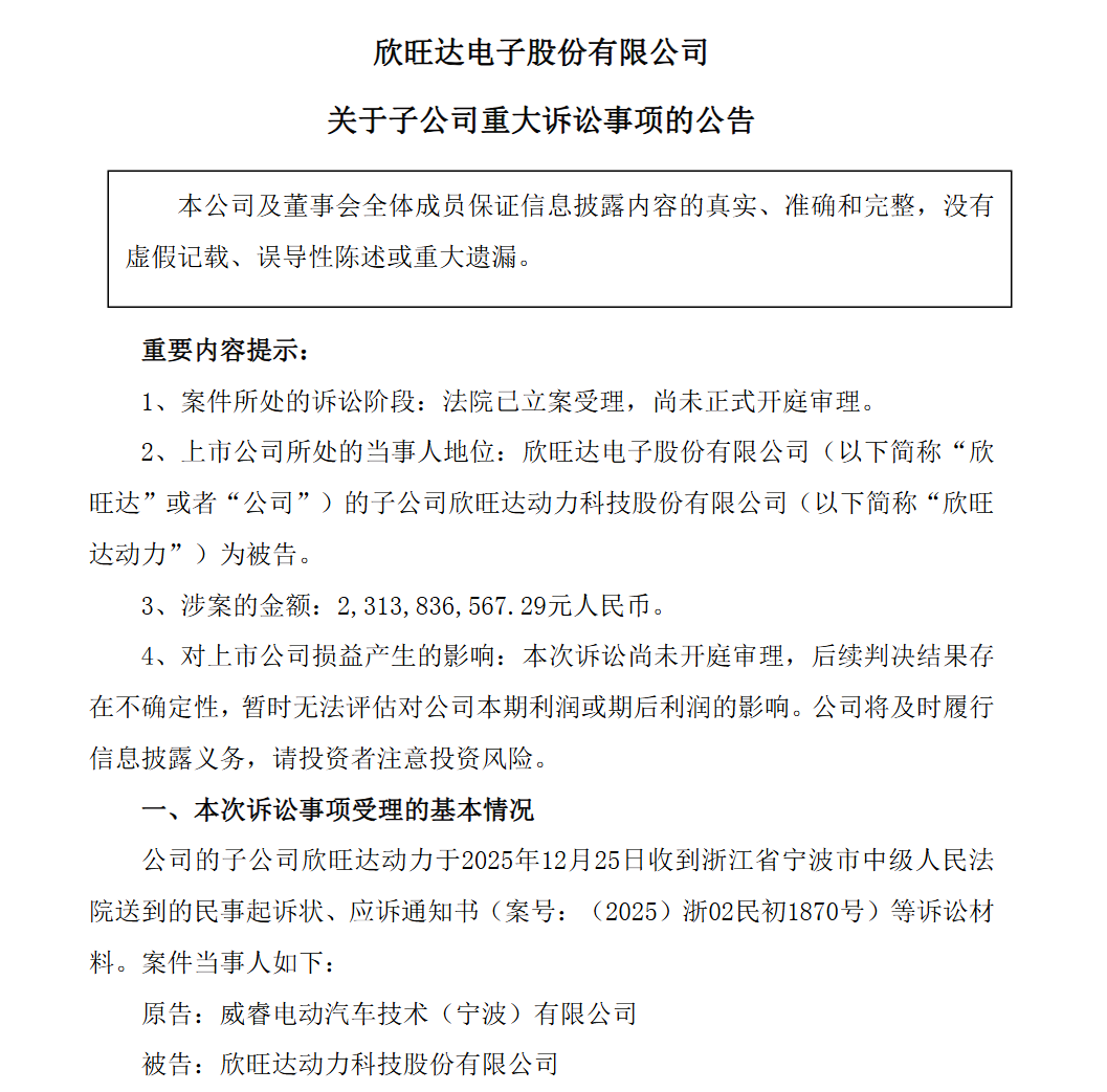欣旺达电子股份有限公司今日发布公告,公司的子公司欣旺达动力于2025年12月25日收到浙江省宁波市中级人民法院送到的民事起诉状、应诉通知书(案号:(2025)浙02民初1870号)等诉讼材料。因买卖合同纠纷,原告威睿电动汽车技术(宁波)有限公司,起诉欣旺达动力科技股份有限公司。