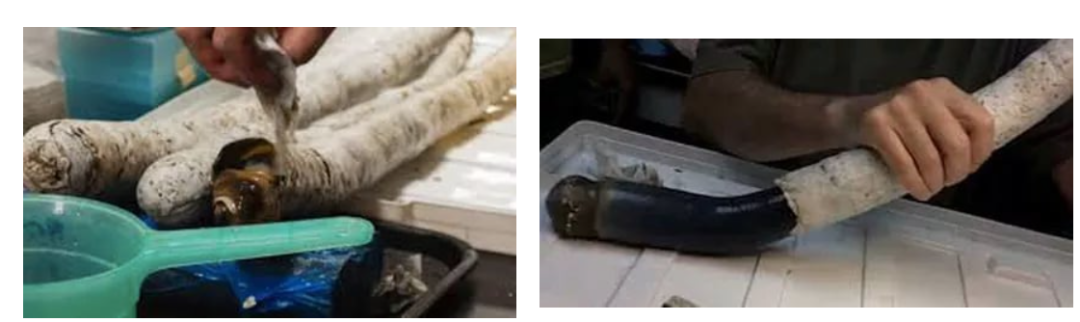 这种外壳被称为管鞘,是这种巨型船蛆的安全住所,它们通过外套膜分泌的碳酸钙建造了这个住所。
