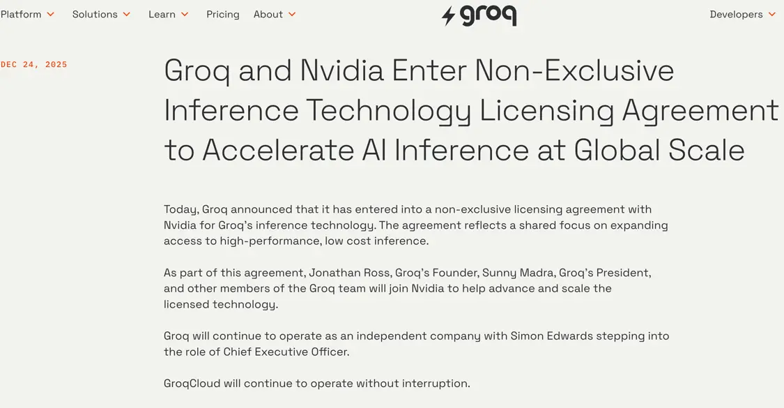 这笔交易已经曝光两天了,但是英伟达既未发布新闻稿也未提交监管文件进行说明。英伟达发言人表示,公司只能确认Groq在周三收盘后发布的仅90字博客内容。周三的美股交易因圣诞假期而缩短。