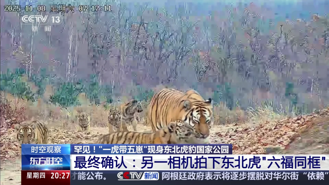 今年8月,央视新闻曾播出一只野生东北虎带着四只新生幼崽出现在东北虎豹国家公园吉林珲春片区的画面,这也是继2013年和2018年之后,珲春第三次记录到“一虎带四崽”的珍贵影像。仅相隔约三个月左右,即11月左右,吉林珲春用一组最新监测到的“一虎带五崽”的罕见影像,刷新了之前的记录。