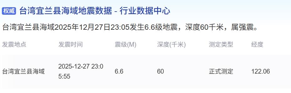 12月27日消息,中国地震台网正式测定:12月27日23时05分在中国台湾宜兰县海域(北纬24.67度,东经122.06度)发生6.6级地震,震源深度60千米。评论区不少网友表示,福建震感超级明显。