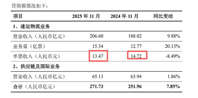 压力仍在延续。今年11月,顺丰控股单票收入同比下跌8.49%至13.47元,较2017年同期的22.17元已跌去近四成。