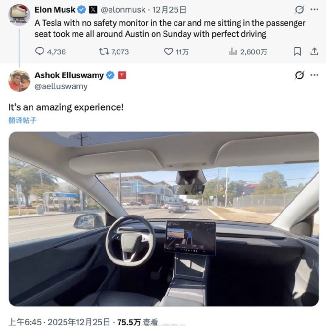 同时马斯克也确认,奥斯汀正开展“无人车、无乘客”的道路测试。