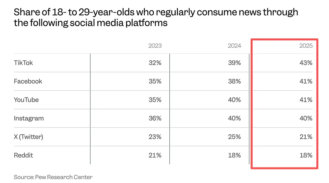 皮尤的数据显示,2025年,43%的年轻成年人表示他们经常从TikTok获取新闻。相比之下,YouTube和Facebook各为41%,Instagram为40%,X为21%,Reddit为18%。