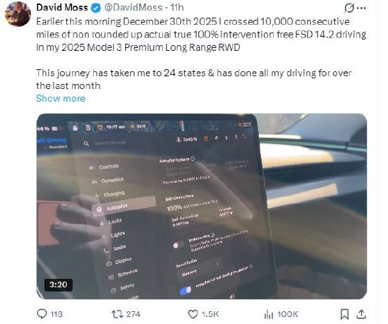 美国一位名叫David Moss的特斯拉车主在社交平台上发帖称,当地时间12月30日,他驾驶自己的一辆2025款Model 3,在100%无干预情况下使用FSD 14.2连续行驶超过了1万英里。该车主表示,这次旅行跨越美国24个州,在过去的一个月里由FSD完成了所有的驾驶,包括所有的泊车和超充站停车。