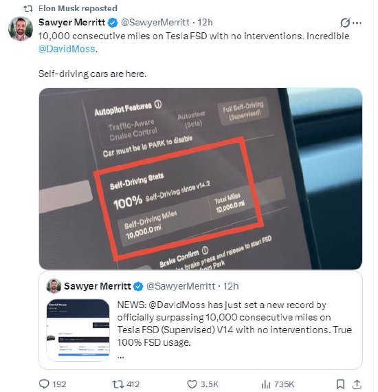 电动汽车分析师索耶·梅瑞特在X上分享了这一消息,并附上了David Moss的行驶记录截图。特斯拉CEO马斯克转发了这条帖子。