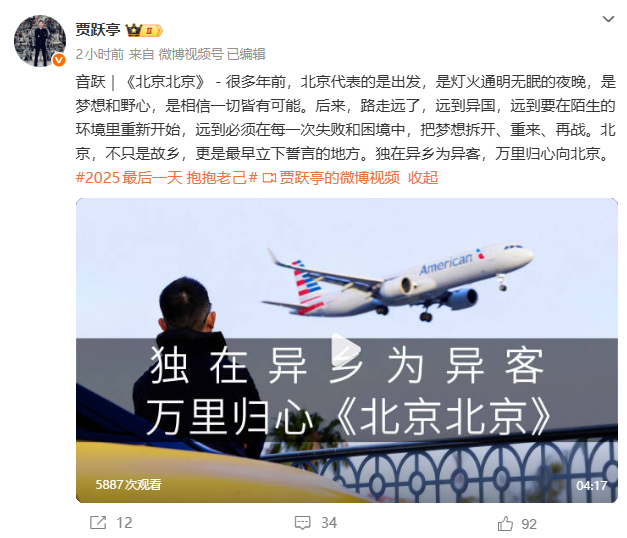 今天是2025年最后一天,赴美造车已8年的法拉第未来联席CEO贾跃亭发布了一段自己演唱歌曲《北京北京》的视频。视频中,有人问贾跃亭是否想念北京,他用略带哽咽的声音回应称:“当然太想了。”贾跃亭表示,自己的孩子以及父母都还在北京,“所以非常非常想念。”