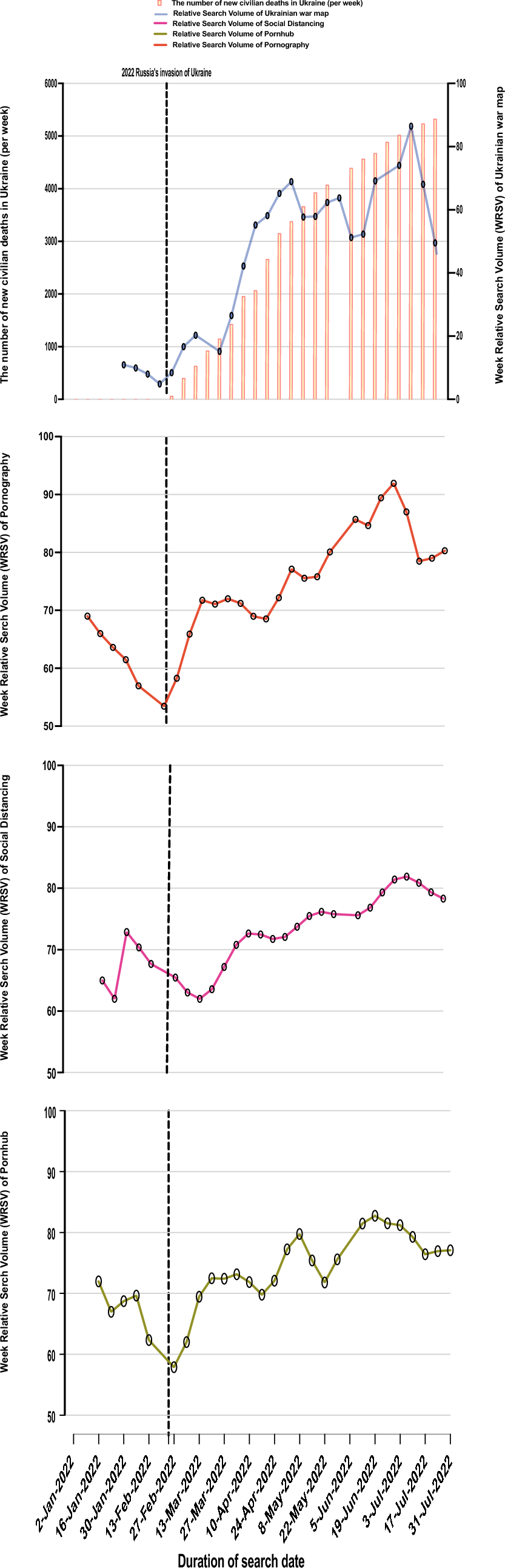 研究团队整合了三类线上数据:一是从Google Trends提取每周相对搜索量,用以追踪不同关键词的热度变化;二是从大型色情网站Pornhub获取观看习惯相关指标;三是从联合国人权事务高级专员办事处获取平民伤亡数据。研究时间范围为2022年1月2日至2022年7月31日,涵盖战争爆发前后数月。