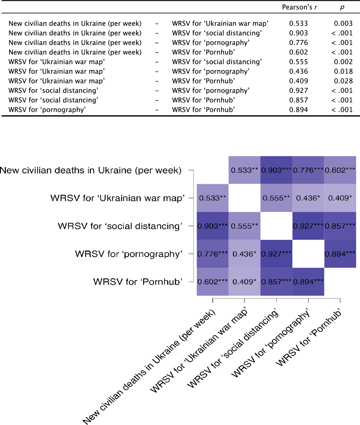 在统计处理上,团队首先利用Shapiro–Wilk检验评估数据是否符合正态分布,以确保后续比较分析的适用性。完成数据特性检验后,研究者进行相关分析,重点考察每周平民死亡人数与色情相关搜索量之间的关系。分析结果显示,自2022年3月初起,乌克兰网民的线上行为出现明显转折,这一时间点与2月24日俄军全面入侵后的战事升级高度重合。