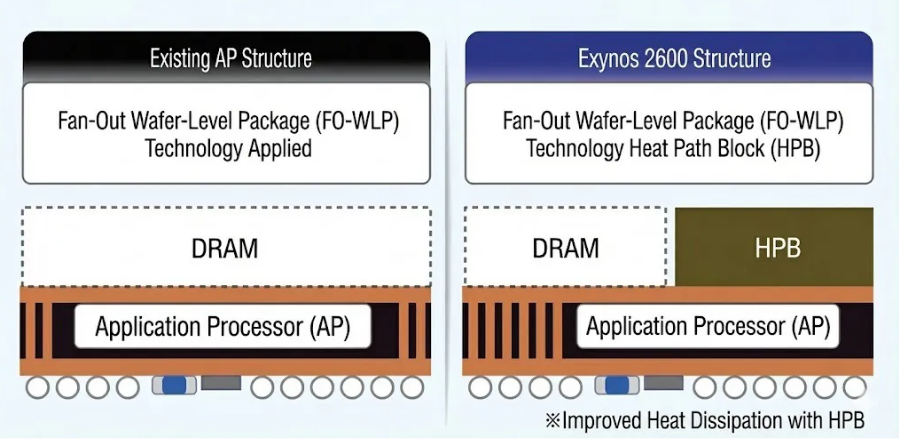 在传统的芯片封装中,处理器与内存通常采用垂直堆叠布局。而三星的SbS技术则改变了这一方式,将芯片模块与DRAM内存水平并排排列,并在两者上方覆盖统一的热传导块(HPB)。