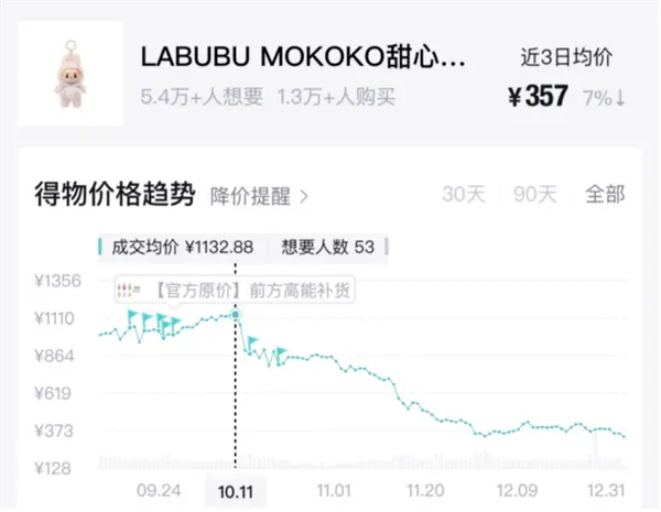 经过10月份东南亚多国快闪店补货,以及国内12月的补货之后,价格逐渐走低。截至12月31日,其成交均价为332.9元,较峰值下跌71.1%。