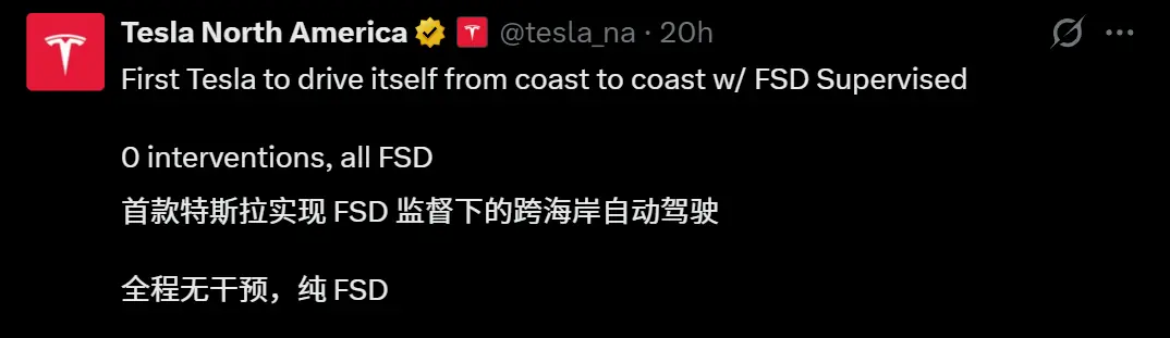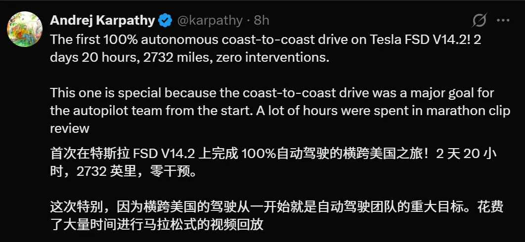 这次横穿美国大陆,不仅体现了FSD V14.2的技术能力,也向整个行业证实——