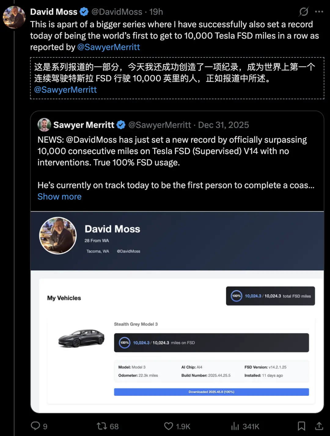 然而David Moss晒出的仪表盘显示,FSD V14千真万确完成了100%的完全自动驾驶。