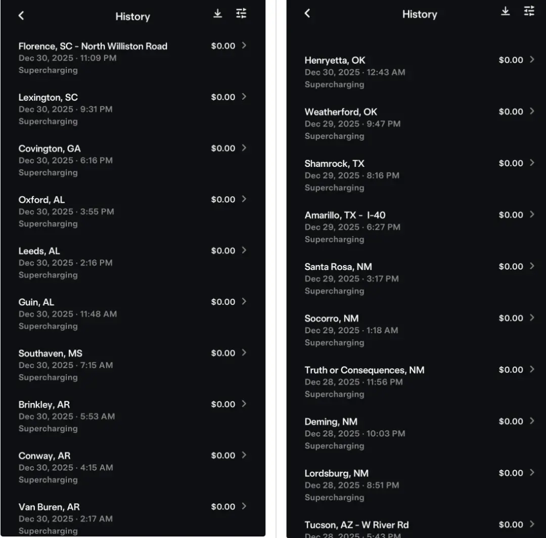 同时,David Moss晒出了充电记录。注意,在所有站点的停车,也都是由特斯拉FSD自动完成的。