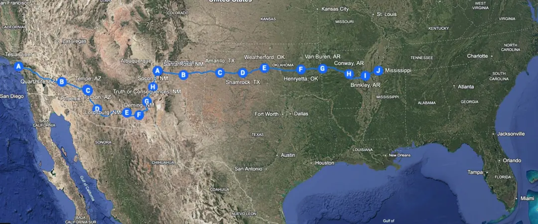 他从洛杉矶的特斯拉餐厅出发,最终到达南卡罗来纳州默特尔海滩,穿越了24个州。