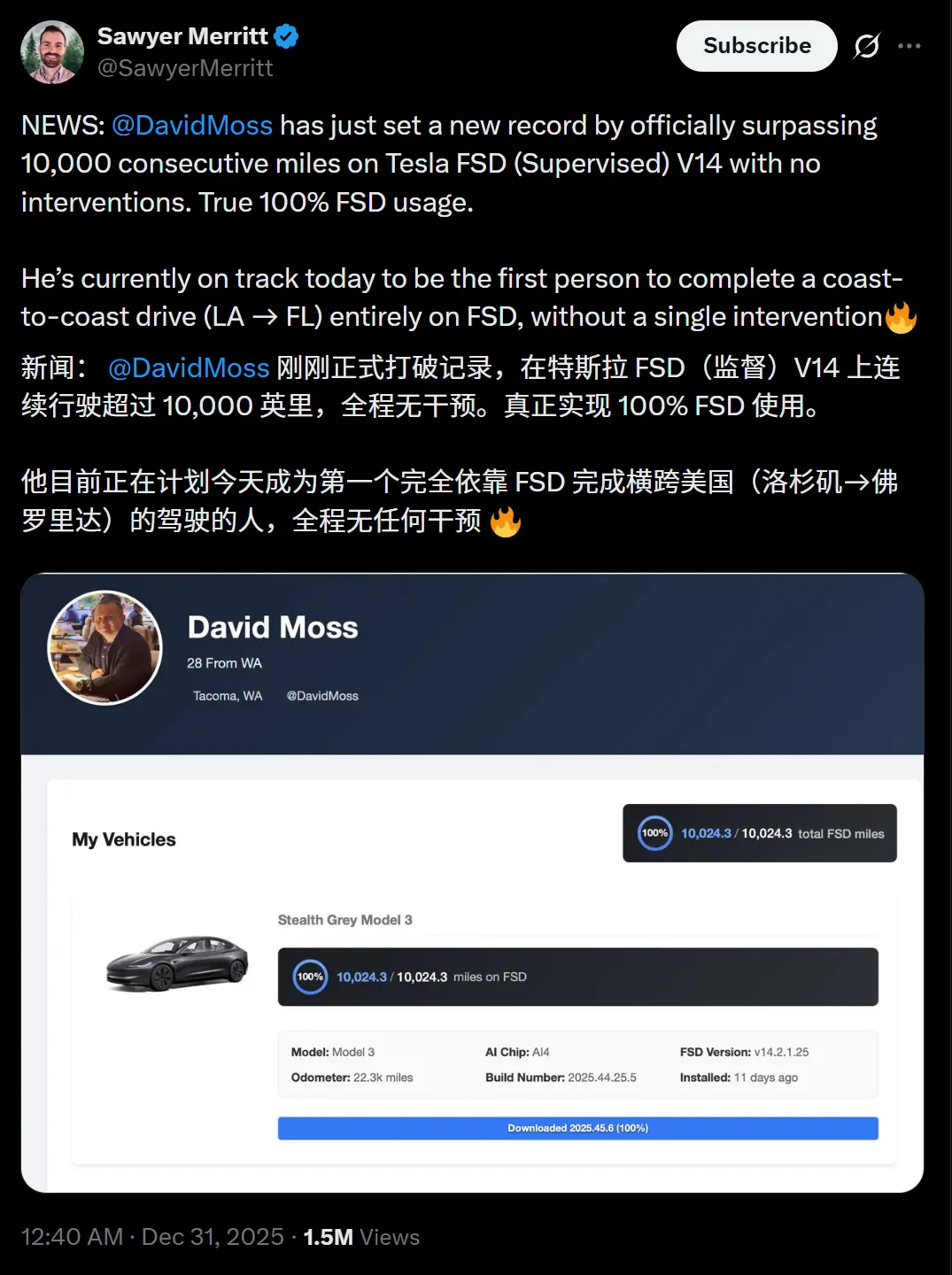 当时,他在特斯拉FSD V14上,连续驾驶了超过10000英里,且全程无干预,实现了真正的100%自动驾驶。