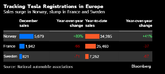 挪威仍是逆势而上的例外,该公司12月在该市场注册了5679辆汽车,同比增长近90%。特斯拉在该市场的受欢迎程度依然不减,去年售出的新车中96%为纯电动汽车。
