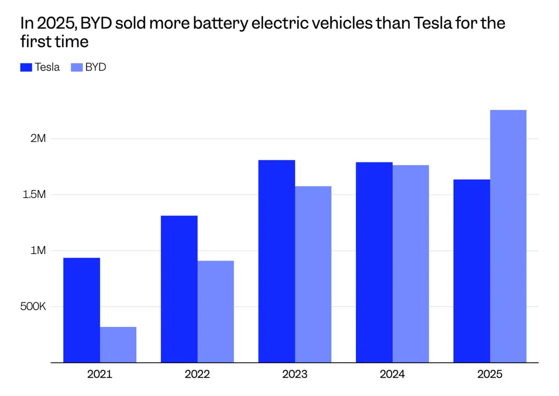 比亚迪周四公布的数据显示,该公司2025年纯电动汽车销量达到225万辆,较上年增长近28%。相比之下,特斯拉周五公布的全年销量为164万辆,同比下降8.5%。