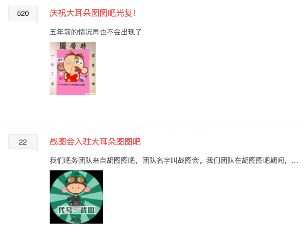 因为“图吧”两个字太隐晦,经常有人不知道全称是啥,直接在百度搜“图吧”——当年百度的匹配算法没有分词,搜出来的第一个是图片贴吧,第二个就是大耳朵图图吧,于是很多人误打误撞进了大耳朵图图吧。