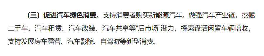 做强汽车产业链,挖掘二手车、汽车租赁、汽车改装、汽车共享等“后市场”潜力,探索盘活闲置车辆增收,支持发展房车露营、汽车影院、自驾游等新型消费。