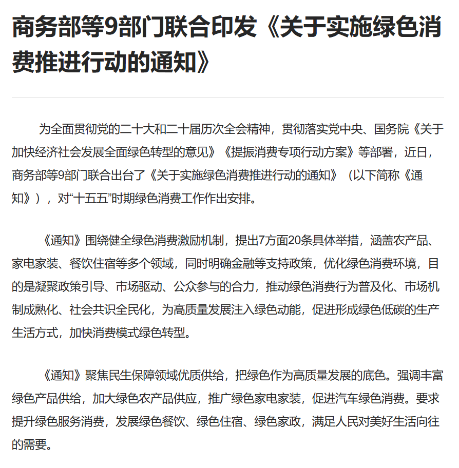 《通知》强调丰富绿色产品供给,加大绿色农产品供应,推广绿色家电家装,促进汽车绿色消费等。