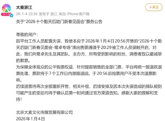 1月4日晚,大麦网浙江站官方微博发布《关于“2026十个勤天后陡门新春见面会”票务公告》。公告内容称,因平台工作人员配置失误,致使本应于2026年1月4日20:56开售的“2026十个勤天后陡门新春见面会-鹭卓专场”演出售票通道于20:29被工作人员误触开启,对此,我们向鹭卓先生及其团队、主办方、所有受到影响的粉丝、消费者致以最诚挚的歉意。