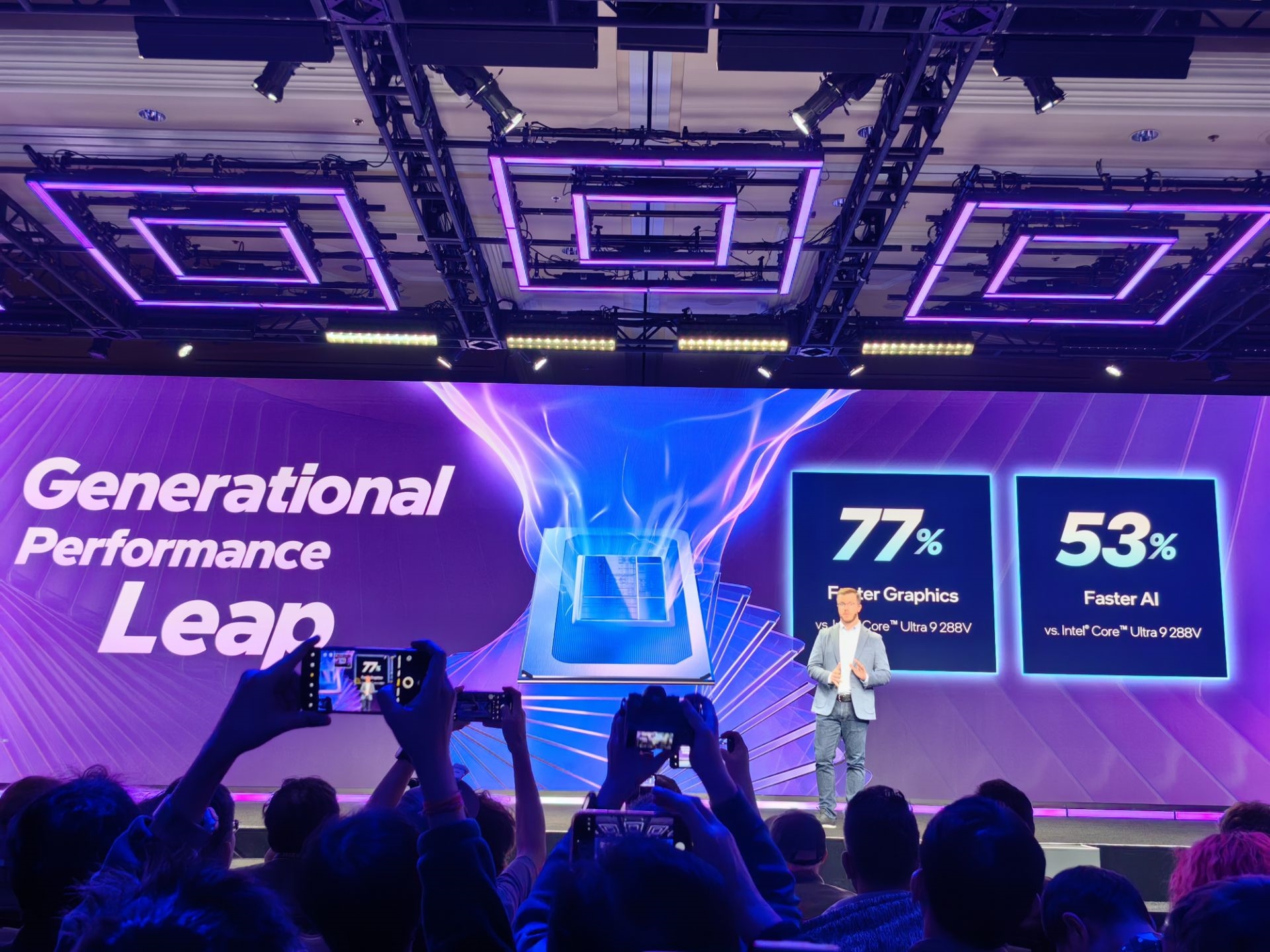锐炫B390集成了多达12个Xe3核心,内置光线追踪、最高120TOPS算力,官方表示图形性能相比酷睿Ultra 9 288V提升了77%,AI性能提升了53%。