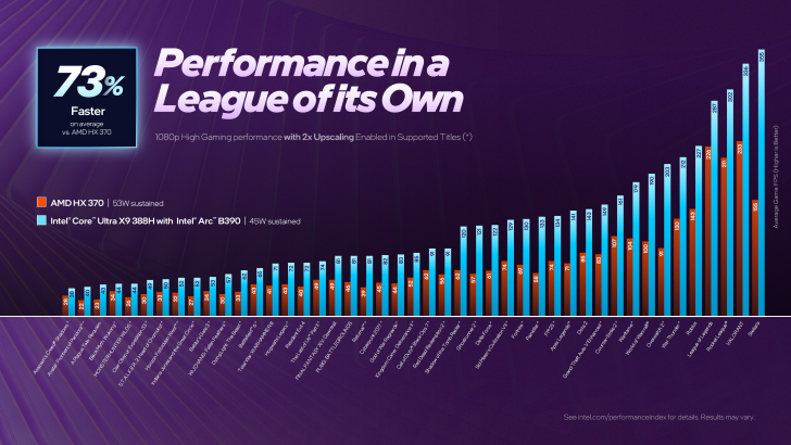 原生性能方面,搭载B390的酷睿Ultra X9 388H在45W功耗下,比53W的AMD Radeon 890M快了82%,更是碾压了高通骁龙X Elite的Adreno GPU,领先达2.6倍。