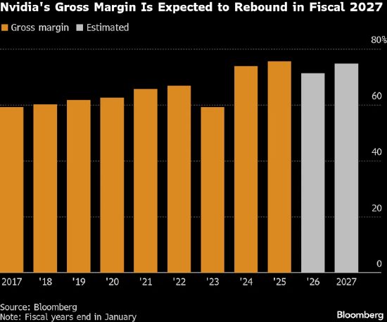 作为衡量盈利能力的关键指标,英伟达的毛利率(不计销货成本)在2024和2025财年维持在75%左右的水平。但在2026财年,由于大力推进Blackwell系列芯片量产导致成本上升,公司毛利率出现下滑。英伟达预计,在截至2026年1月31日的2026财年,毛利率将降至71.2%,并计划在2027财年回升至75%左右。由此可见,一旦毛利率未能达到预期,华尔街或将拉响警报。