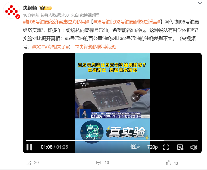 央视频发文称,网传“加95号油更经济实惠”,许多车主纷纷转向高标号汽油,希望能省油省钱。这种说法有科学依据吗?实验对比为大家揭开了真相。根据中华人民共和国国家标准车用汽油规定,95号汽油是指研究法辛烷值为95,相当于95%异辛烷加上5%正庚烷所组成的混合物的抗爆震性能,属于高标号汽油。