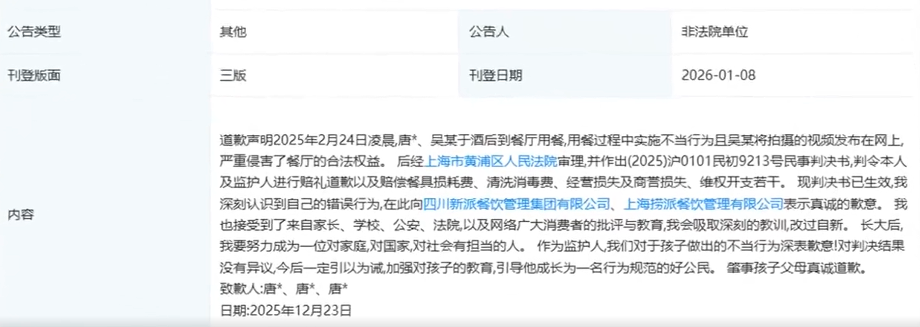 海底捞小便案有了最新进展。企查查APP显示,今日,法院刊登海底捞小便当事人及其父母道歉声明。当事人唐某表示:“我深刻认识到自己的错误行为,在此向四川新派餐饮管理集团有限公司、上海捞派餐饮管理有限公司表示真诚的歉意。”