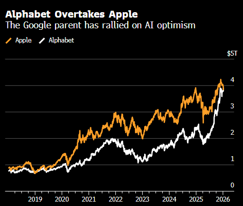 这是自2019年以来Alphabet的市值首次超过苹果。英伟达仍是全球市值最大的股票,约4.6万亿美元。