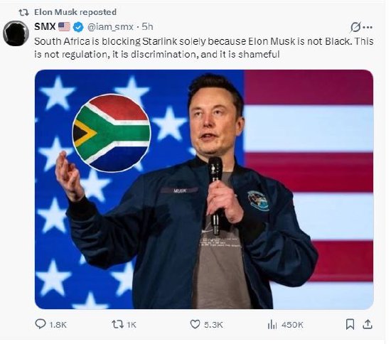 马斯克还转发了美国新闻网站SMX的一条帖子,该帖子称:“南非屏蔽星链仅仅是因为埃隆·马斯克不是黑人。这不是监管,这是歧视,这是可耻的。”