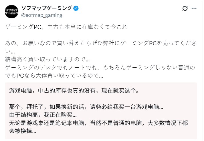Sofmap在贴文中直言:“现在电竞PC极其短缺,即便是二手货也完全没库存了。”