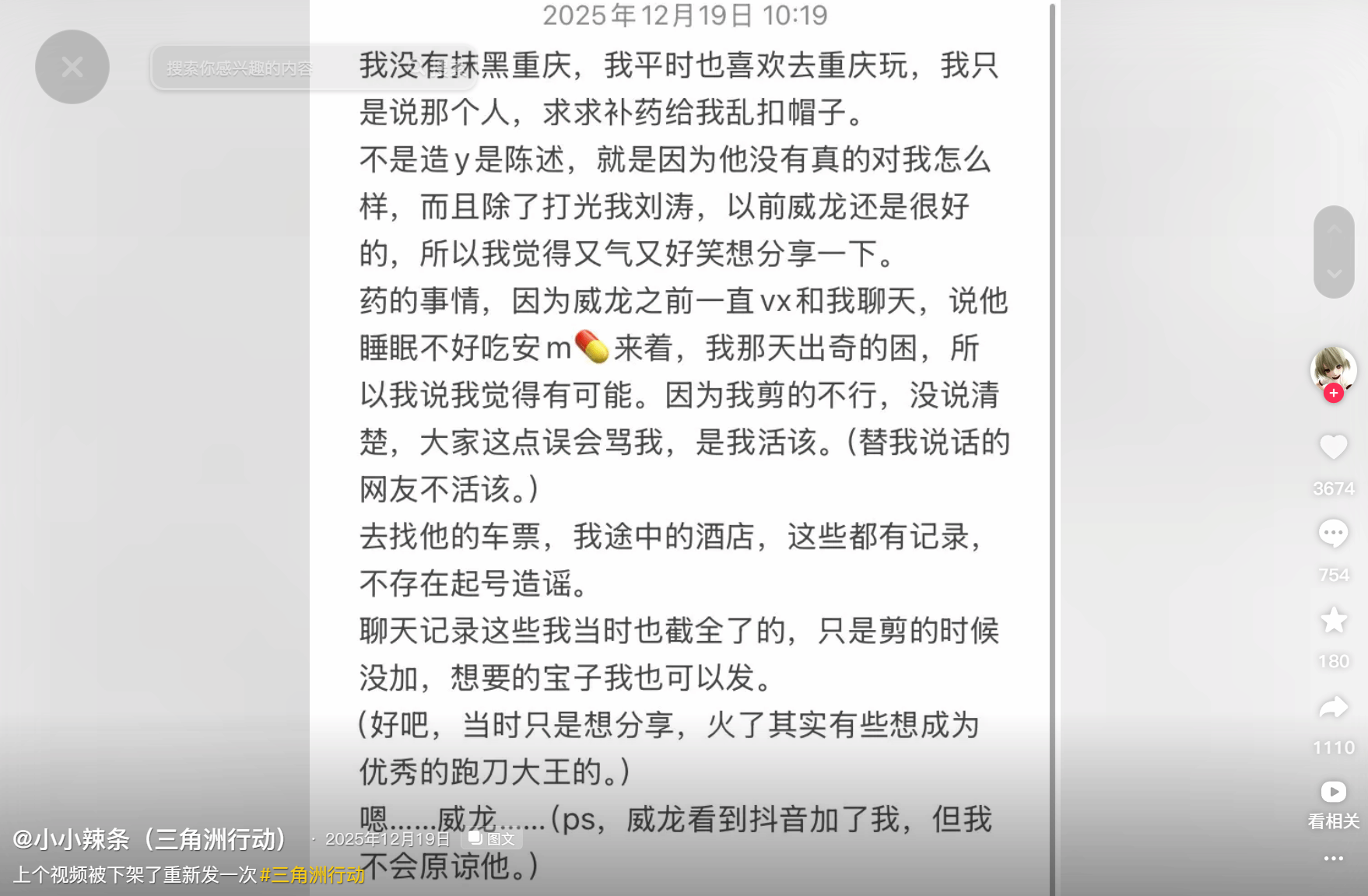 两人见面后一同吃饭、喝奶茶,并前往网吧打游戏。然而,当晚九点左右,平时精力旺盛的“小小辣条”突然感到异常疲惫,回到酒店后迅速失去意识。次日醒来,她发现自己衣着整齐,身体也无异样,起初还以为是旅途劳顿。直到登入《三角洲行动》才惊恐地发现,游戏仓库已被洗劫一空。