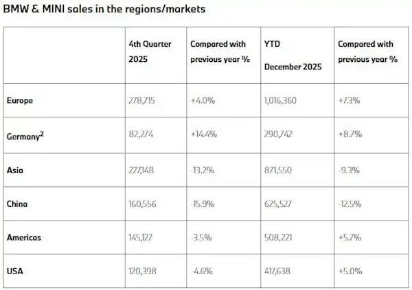宝马集团近日公布了集团销量。数据显示,宝马2025年全年销量为2463715辆,同比微增0.5%。分区域来看,欧洲市场全年累计销量达1,016,360辆,同比增长7.3%;美国市场全年累计销量为417,638辆,同比增长5.0%。