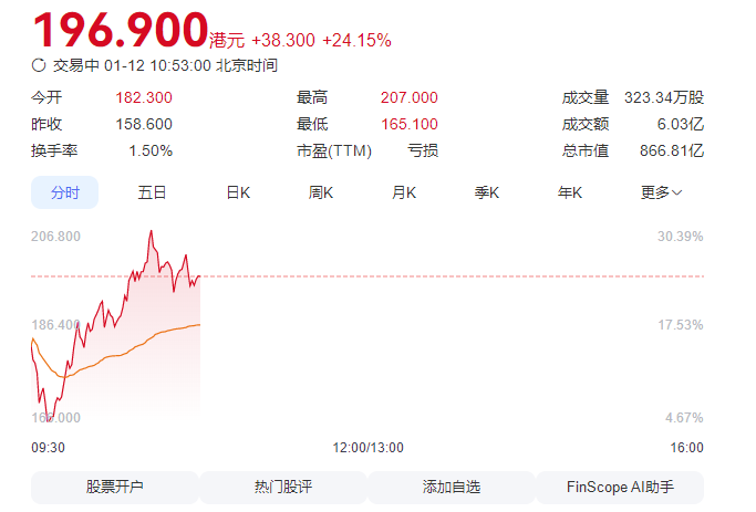 截至1月12日本文发稿前,智谱股价最高达 207 港元 / 股,总市值来到了 866.81 亿港元。