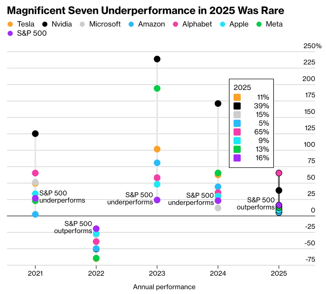 美股科技七巨头指的是特斯拉、英伟达、微软、亚马逊、苹果、Alphabet以及Meta。彭博数据显示,2025年,Alphabet和英伟达的股价分别上涨了65%、39%,跑赢了标普500指数的16%涨幅。除此之外,其他五家公司均跑输。