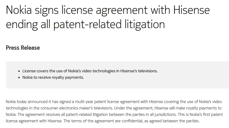 根据协议,海信在其电视产品中使用诺基亚的视频相关技术,并将为此向诺基亚支付专利许可费。这是诺基亚与海信之间达成的首份专利许可协议,具体的协议条款和金额将按双方约定保密。